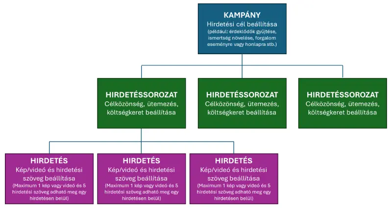 A Facebook kampányok felépítése piramisra hasonlít. Legfelül a kampány áll, ahol a hirdetés célja állítható be. Ilyen célok lehetnek új érdeklődők keresése, ismertség növelése, forgalom irányítása honlapra vagy eseményre és hasonlók.